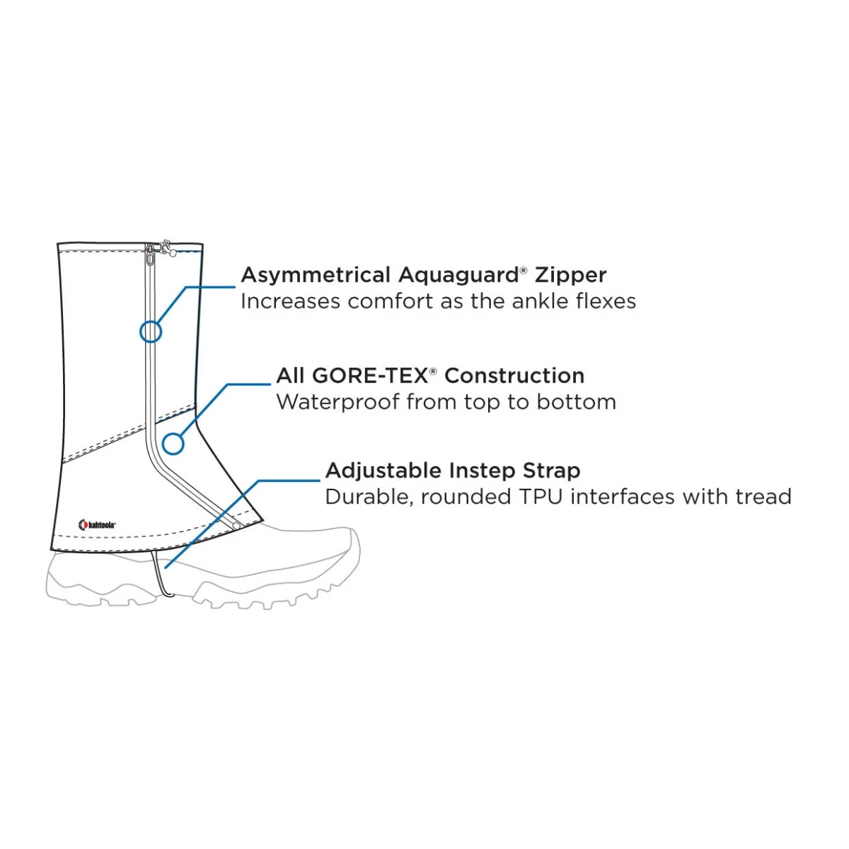 The Kahtoola LEVAgaiter Tall GTX is the lightest-weight and most versatile all-around GORE-TEX gaiter on the market. Constructed from a breathable three-layer GORE-TEX, the LEVAgaiter keeps out moisture and trail debris, providing superior comfort. The easily adjustable TPU instep strap and elasticized drawcord ensure a secure fit with low-profile hiking and backpacking boots. Offset, asymmetrical zippers allow for quick entry and exit, and when your activity is done, the LEVAgaiter packs down small and compact in the included tote sack.