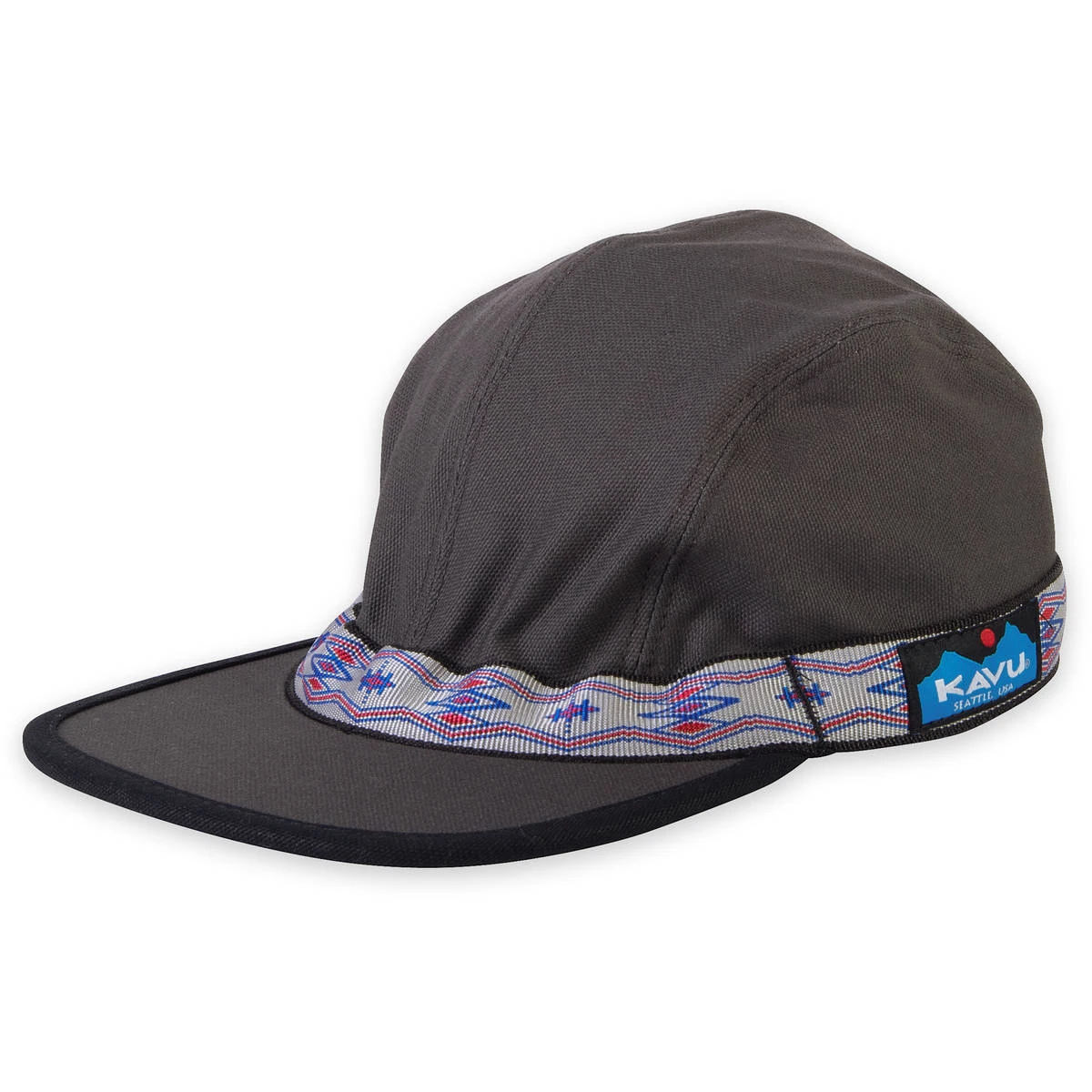 4 panel cap, slight curved bill, black underbill, patterned nylon tubular webbing with KAVU adjustment